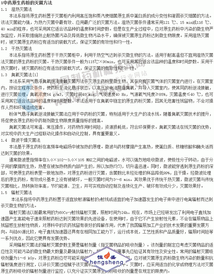 中藥原生藥粉滅菌是指用適當的物理或化學手段將中藥原生藥粉中活的微生物殺滅或除去的方法。在中成藥生產過程中,原生藥粉的滅菌結果對于成品能否符合質量要求關系極大,故在原生藥粉入藥前,對微生物限度超標的原生藥粉一定要采用合適的滅菌方式進行滅菌。現在常用的滅菌法有很多,簡而易行、不嚴重破壞有效成分、適宜合的滅菌方法是值得探討的。